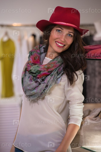 Красивая женщина делает покупки в магазине одежды