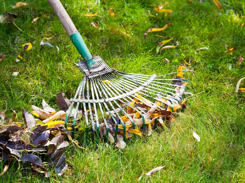 Очистка зеленого газона от опавших листьев