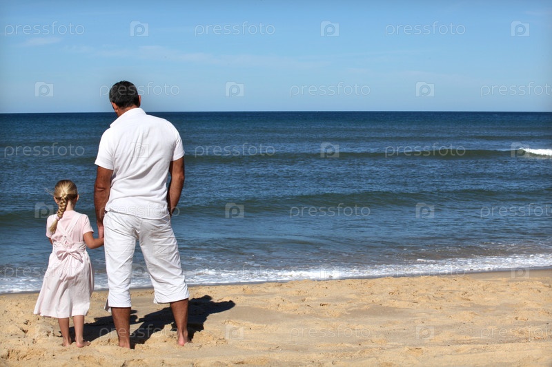 Отец и дочь смотрят на горизонт на пляже