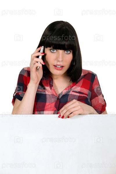 Женщина на сотовым телефоном и чистой доской для вашего сообщения
