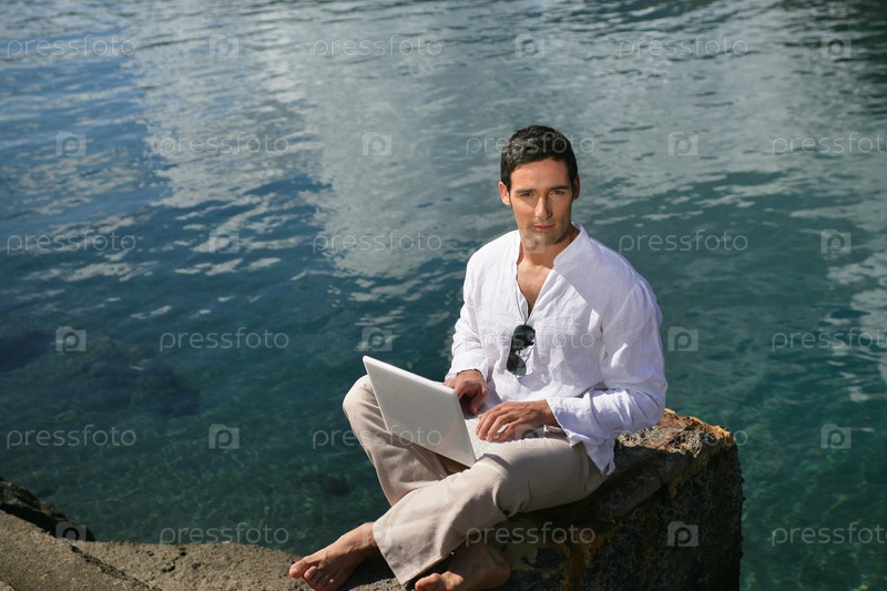 Красивый мужчина с ноутбуком на пляже