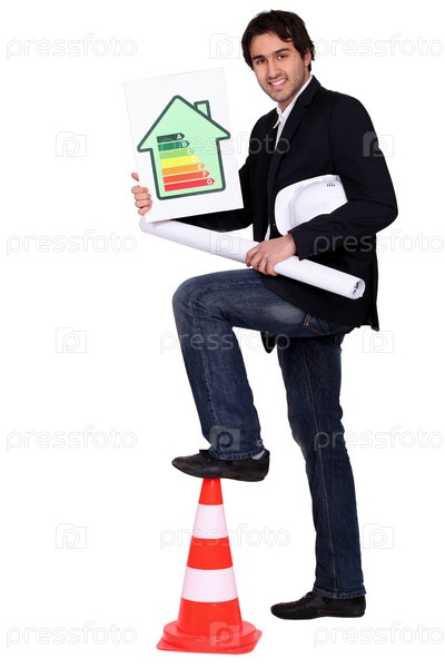 Инженер держит диаграмму энергоэффективности и свернутый чертеж