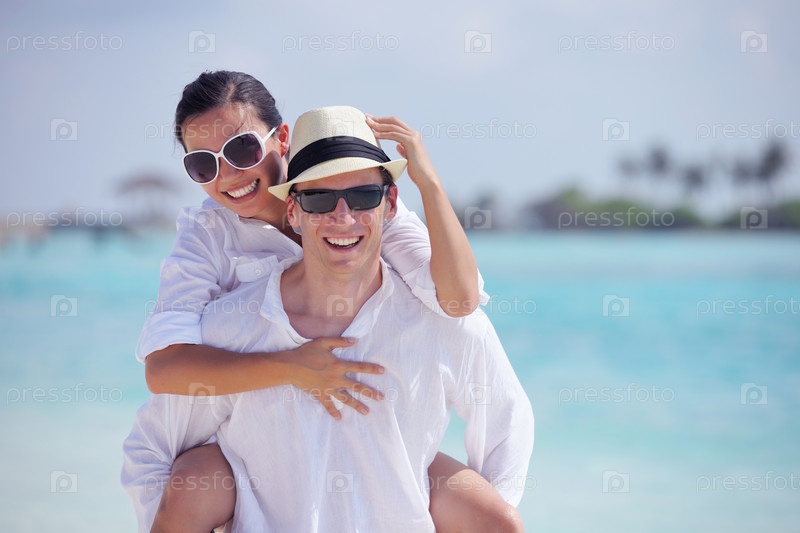 Счастливая молодая пара весело проводит время на пляже