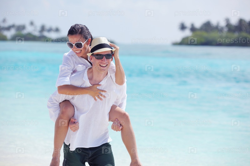 Счастливая молодая пара весело проводит время на пляже