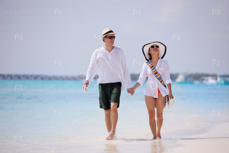 Счастливая молодая пара весело проводит время на пляже