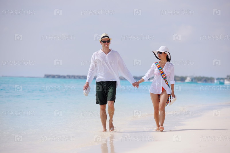 Счастливая молодая пара весело проводит время на пляже