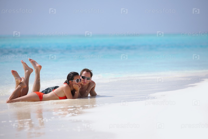 Счастливая молодая пара весело проводит время на пляже