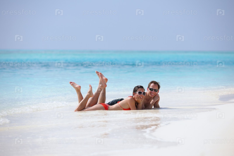 Счастливая молодая пара весело проводит время на пляже