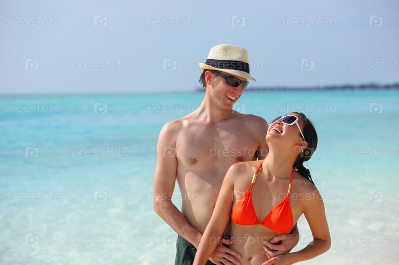 Счастливая молодая пара весело проводит время на пляже