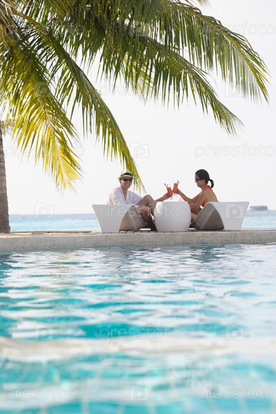 Счастливая молодая пара отдыхает и пьет напитки