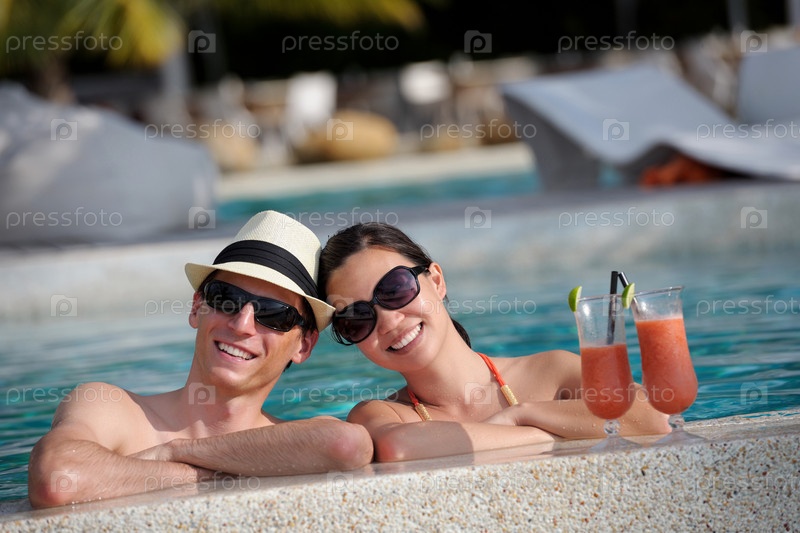 Счастливая молодая пара отдыхает и пьет напитки