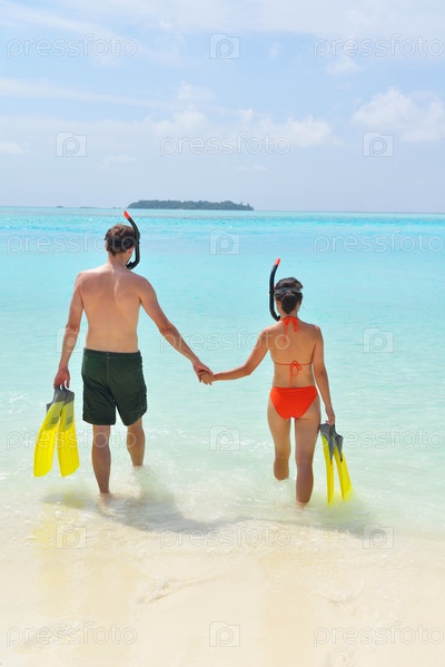 Счастливая молодая пара весело проводит время на пляже