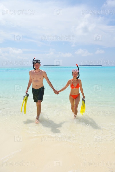 Счастливая молодая пара весело проводит время на пляже