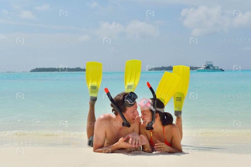 Счастливая молодая пара весело проводит время на пляже