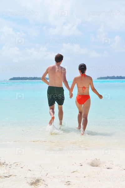 Счастливая молодая пара весело проводит время на пляже
