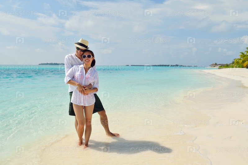 Счастливая молодая пара весело проводит время на пляже
