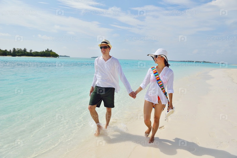 Счастливая молодая пара весело проводит время на пляже