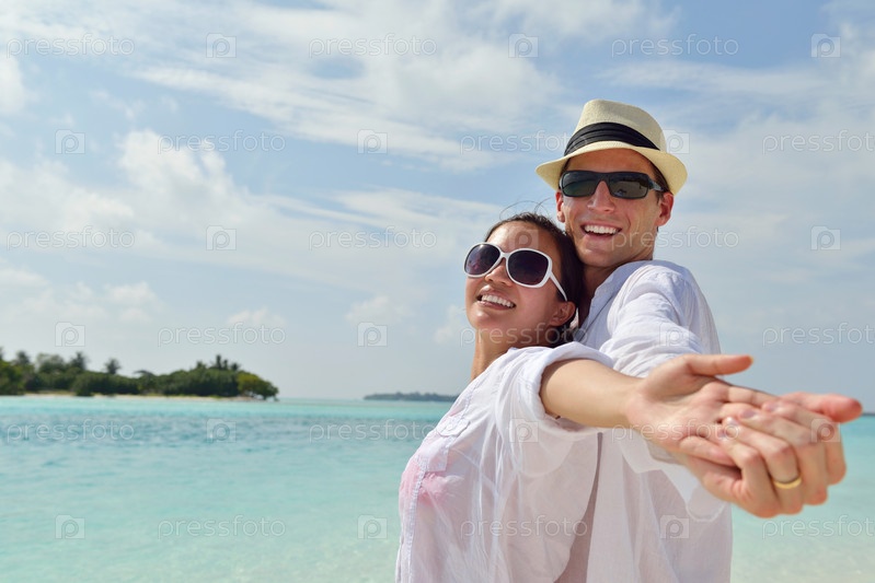 Счастливая молодая пара весело проводит время на пляже
