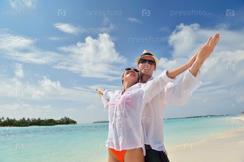 Счастливая молодая пара весело проводит время на пляже