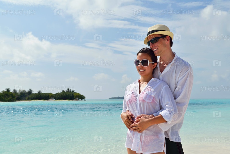 Счастливая молодая пара весело проводит время на пляже