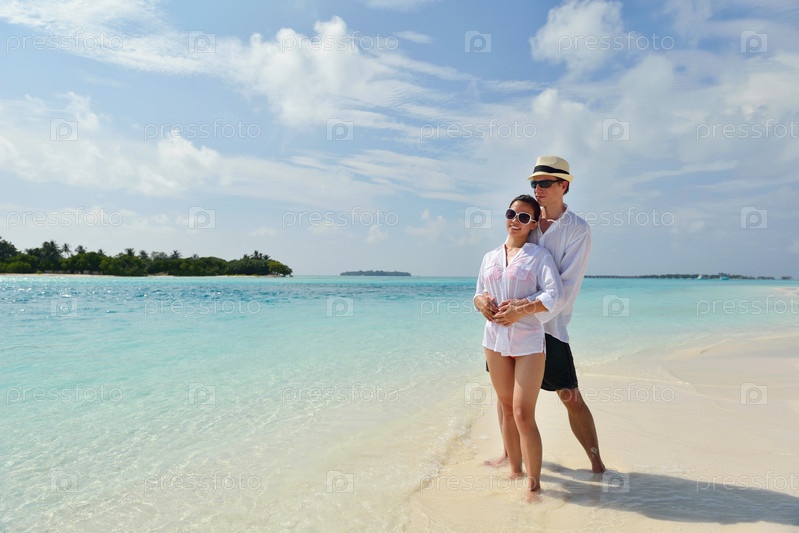 Счастливая молодая пара весело проводит время на пляже