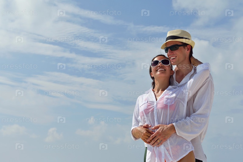 Счастливая молодая пара весело проводит время на пляже