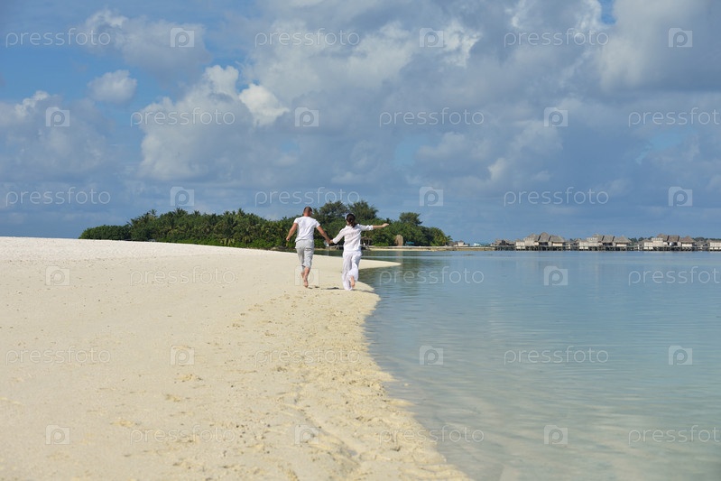 Счастливая молодая пара весело проводит время на пляже