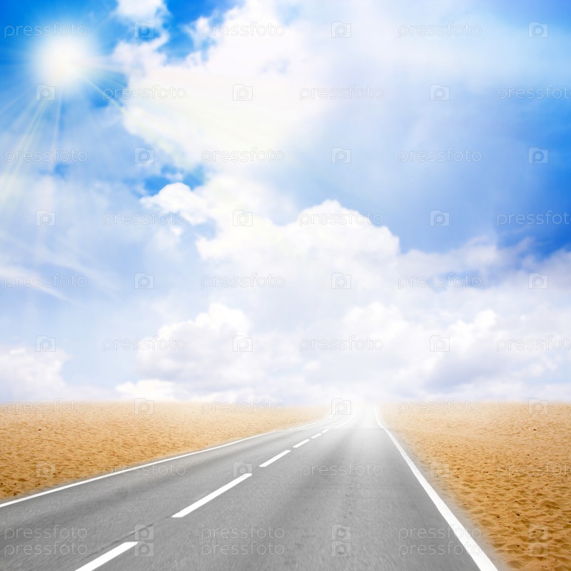 Яркое солнце в облачном небе освещает пустынное шоссе
