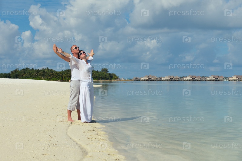 Счастливая молодая пара весело проводит время на пляже