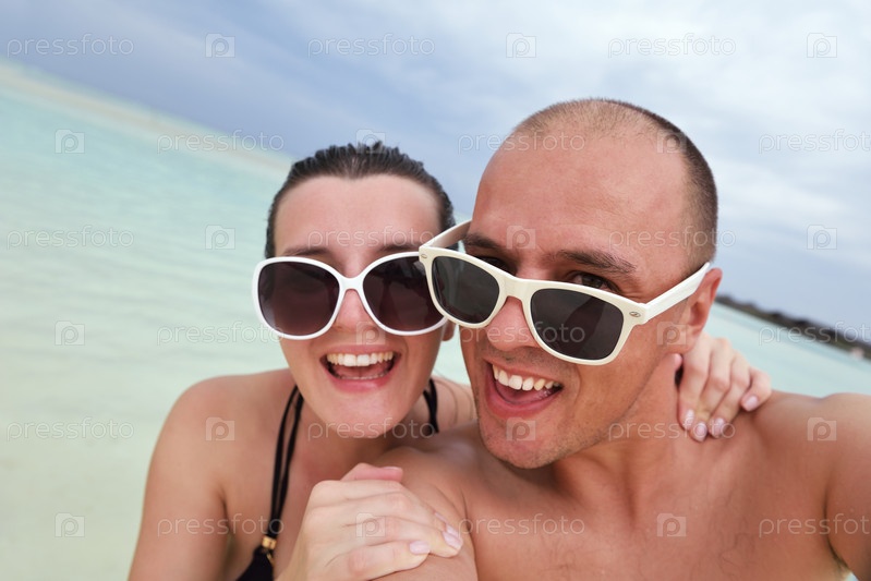 Счастливая молодая пара весело проводит время на пляже