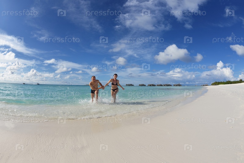 Счастливая молодая пара весело проводит время на пляже