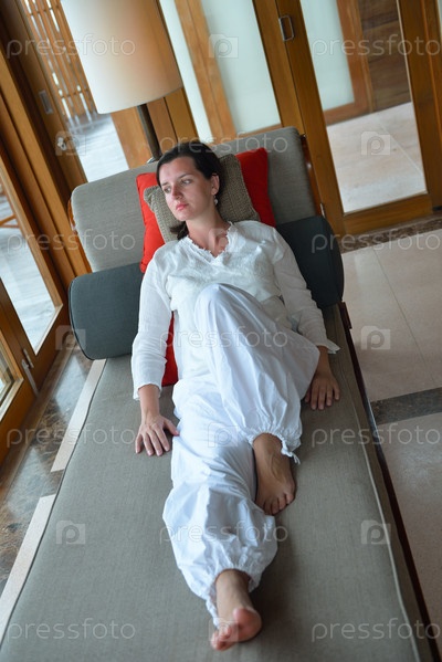 Счастливая молодая женщина отдыхает дома на диване