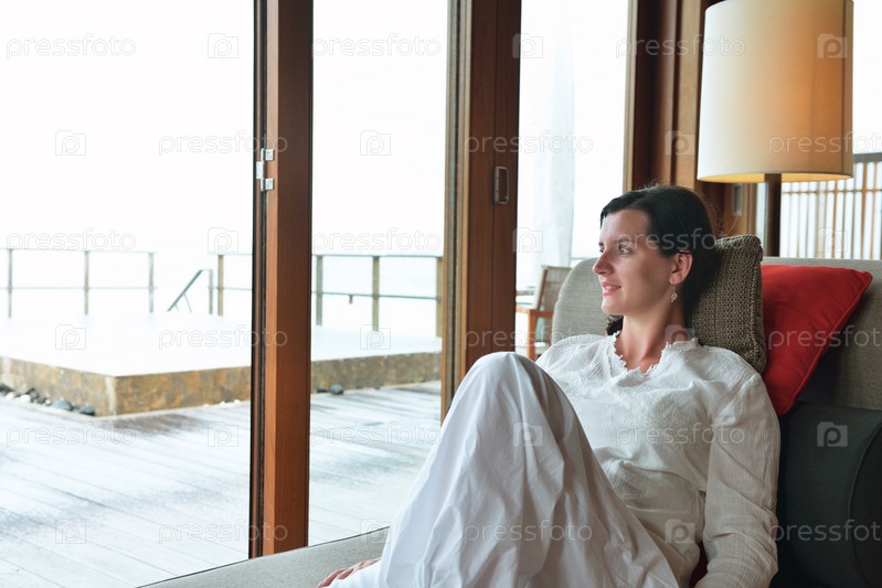 Счастливая молодая женщина отдыхает дома на диване