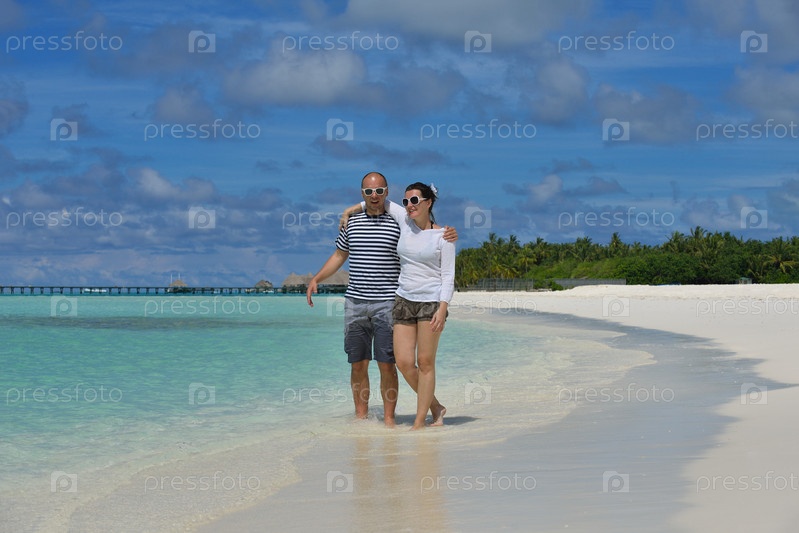 Счастливая молодая пара весело проводит время на пляже