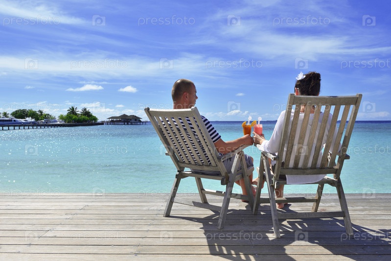 Счастливая молодая пара отдыхает и пьет напитки