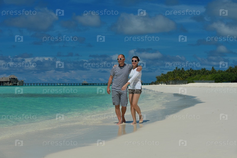 Счастливая молодая пара весело проводит время на пляже