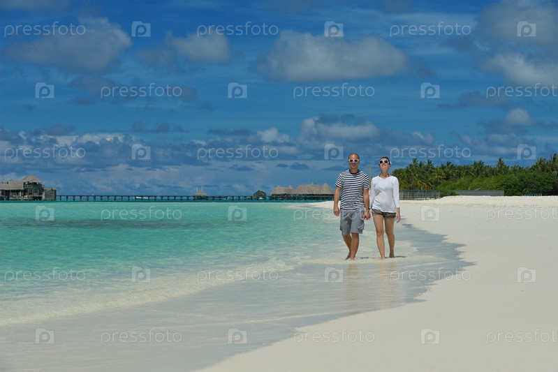 Счастливая молодая пара весело проводит время на пляже