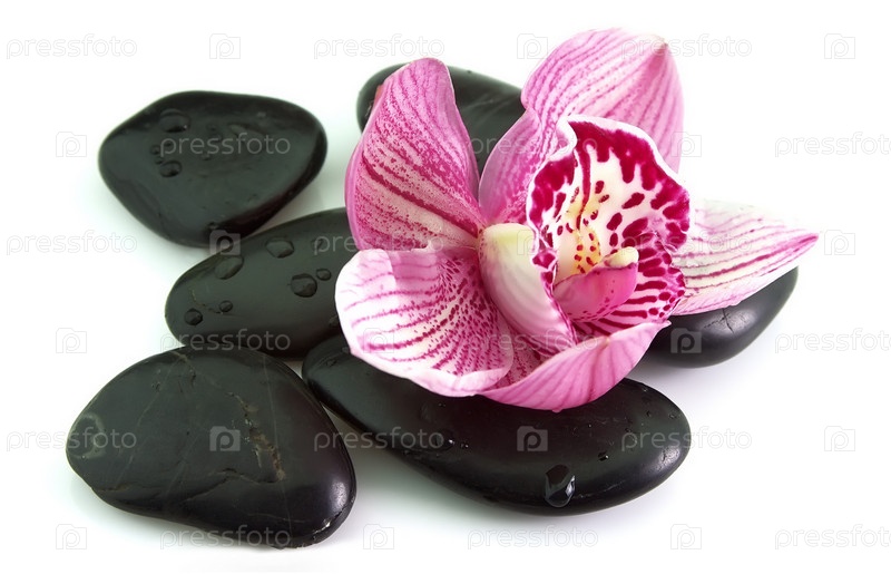Гладкие черные камни и цветок орхидеи на белом фоне