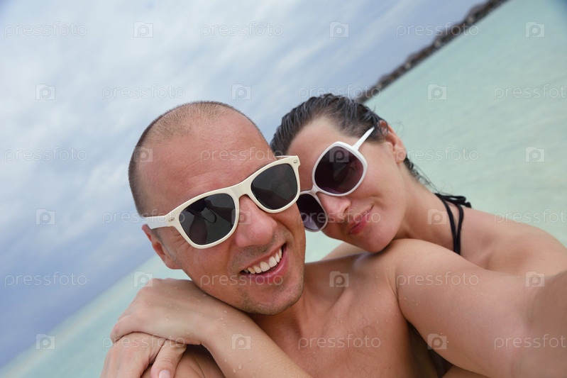 Счастливая молодая пара весело проводит время на пляже