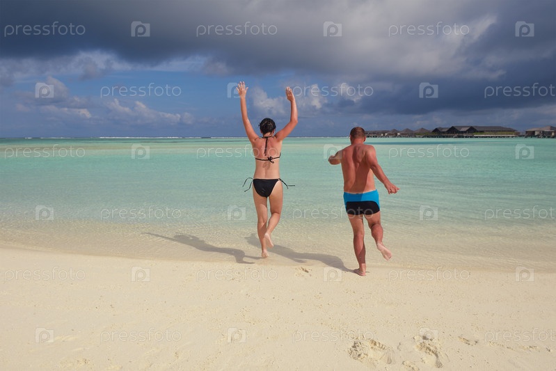 Счастливая молодая пара весело проводит время на пляже