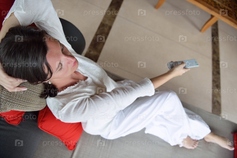 Счастливая молодая женщина отдыхает дома на диване