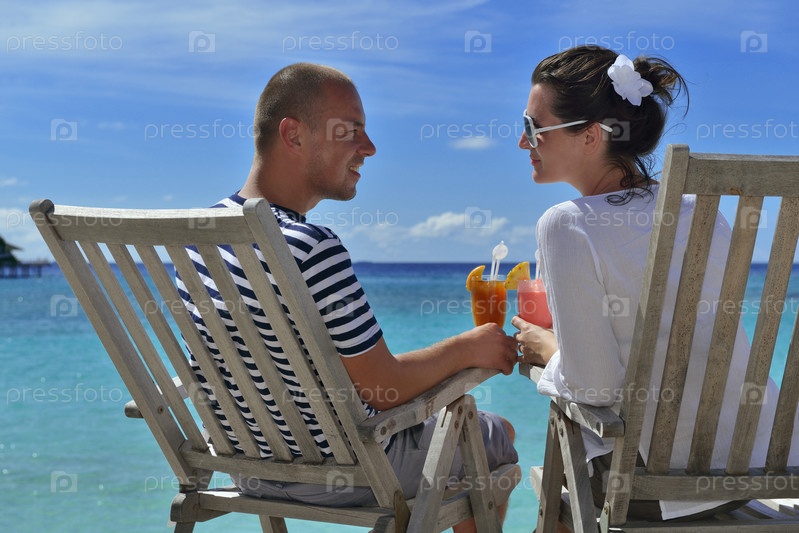 Счастливая молодая пара отдыхает и пьет напитки