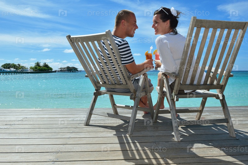 Счастливая молодая пара отдыхает и пьет напитки