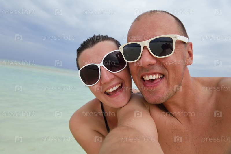 Счастливая молодая пара весело проводит время на пляже