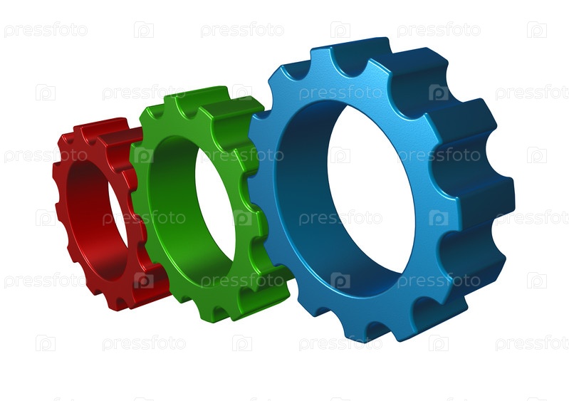Зубчатые колеса в гамме rgb на белом фоне, 3d иллюстрация