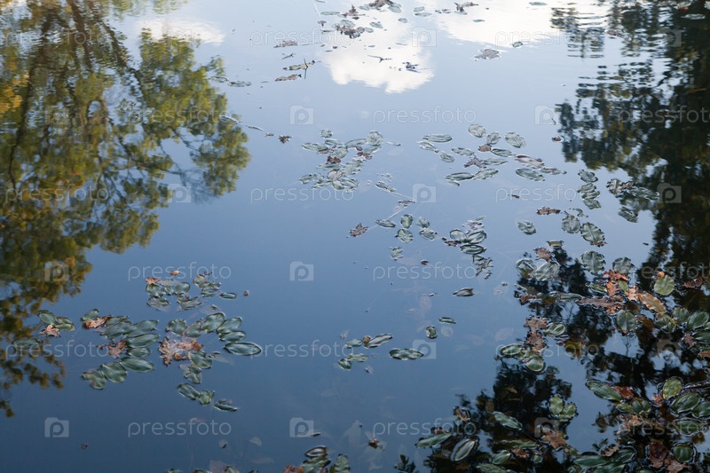 Красочная листва, плавающая в темной осенней воде с отражением деревьев