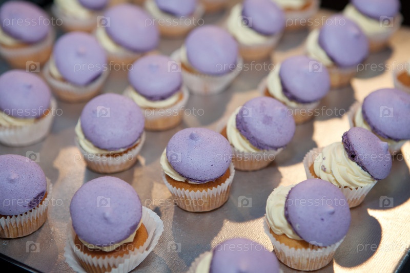 Пирожное с желтым кремом и фиолетовыми украшениями
