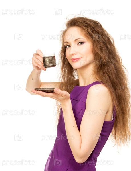 Молодая счастливая женщина держит чашку кофе, изолированная