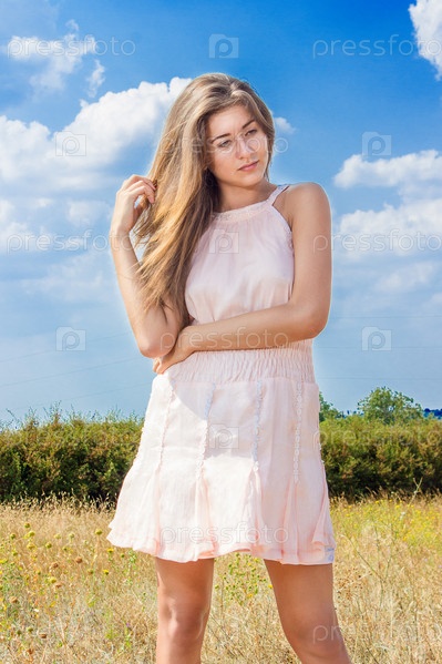 Портрет красивой молодой женщины на фоне природы и голубого неба с облаками