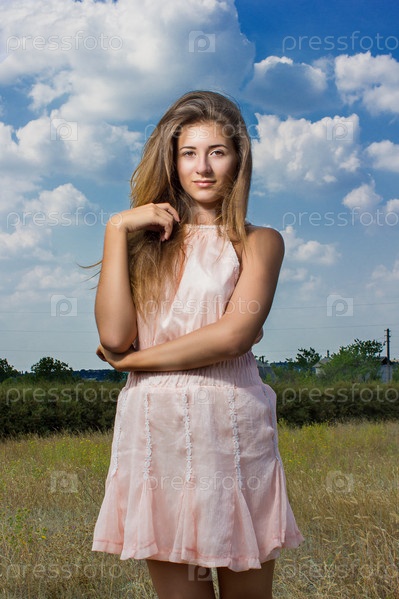 Портрет красивой молодой женщины на фоне природы и голубого неба с облаками